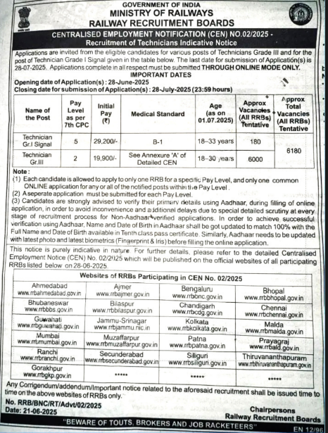 RRB Technician Recruitment 2025: रेलवे विभाग में 6,374 टेक्नीशियन पदों पर निकलने वाली है भर्ती, जानें पूरी जानकारी