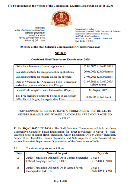 SSC JHT, JT, CHT Recruitment 2025:. Staff Selection Commission के तरफ से आधिकारिक नोटिफिकेशन जारी किया गया है जिसमें SSC/ JHT/ SSC जूनियर हिंदी ट्रांसलेटर पदों के भर्ती के बारे में बताया गया है और इसमें 437 पदों की भर्ती निकली है ऐसा अनुमान लगाया जा रहा है अगर आप लोग इस भर्ती में आवेदन करना चाहते हैं तो इस आर्टिकल में मैंने आपको स्टेप बाय स्टेप पूरा तरीका बताया है और साथ में मैंने आप लोगों को अभी बताया है कि आवेदन करने के लिए क्या-क्या दस्तावेज चाहिए आवेदन शुल्क कितना लगेगा और कितना आपको सैलरी मिलेगा एक-एक जानकारी को आप बिल्कुल अच्छे से पढ़े तभी आपको समझ में आएगा